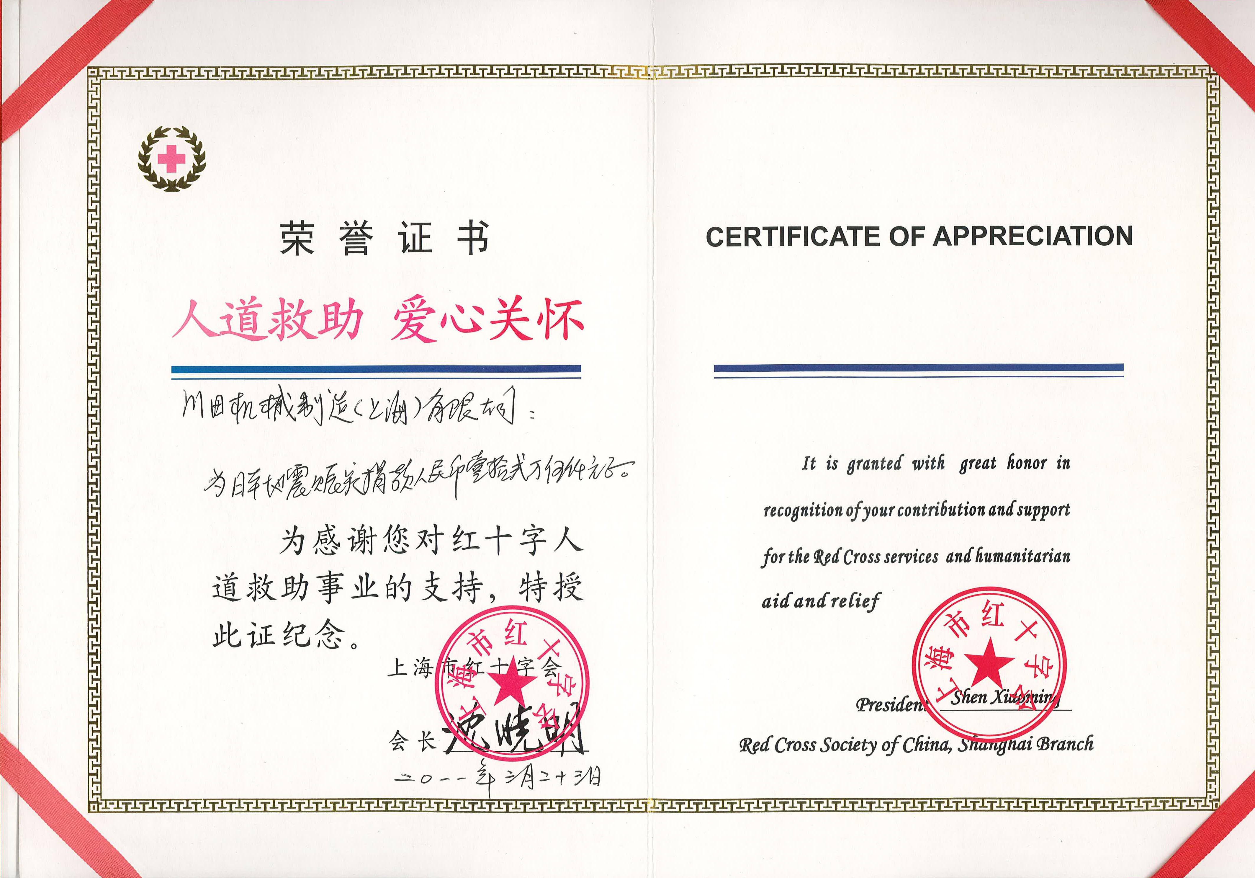 2011 上海市红十字会荣誉证书 川田机械